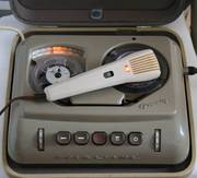 Es sei erwähnt, daß der Kurzrücklauf über eine elektromagnetische Steuereinrichtung erfolgt, wobei die Länge ( = Zeit) des Rücklaufs durch die Zeitkonstante von RC-Gliedern bestimmt wird. Start und Stop kann auch über den Fußschalter erfolgen. Ferner ist das Gerät an ein Rundfunkgerät anschließbar, wobei die Wiedergabe über den eingebauten Lautsprecher erfolgt. Als Kopfhörer steht ein magnetischer Kleinsthörer mit verschiedenen Halterungen zur Verfügung; das Aufsprechmikrofon darf als Wiedergabelautsprecher — und der erwähnte Kleinsthörer als Behelfsmikrofon verwendet werden! Die Steckerverbindungen — auch zum Telefonadapter — erfolgen über Tuchelkontakte. Das ist eine sehr vernünftige Maßnahme, denn diese Kontakte sind auch noch nach Jahren betriebssicher.
