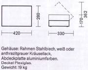 Gehäuse: Rahmen Stahlblech, weiß oder anthrazitgrauer Kräusellack, Abdleckplatte aluminiumfarben. - Deckel Plexiglas. Gewicht: 19 kg